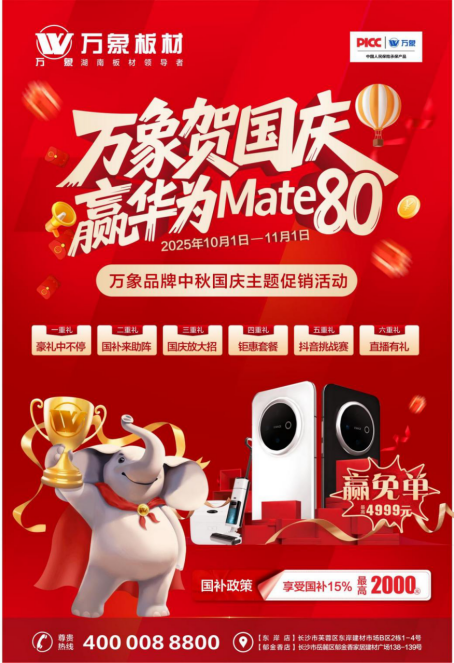 金秋十月,中秋國慶雙節(jié)疊加,家居消費市場熱潮涌動,各品牌紛紛加碼營銷釋放福利。在此競爭格局下,旺德府集團作為湖南家居建材領軍、全國行業(yè)的知名企業(yè),秉承“為千萬客戶創(chuàng)享美好健康環(huán)境”的企業(yè)愿景,傾力整合旗下兩大核心品牌——萬象板材與萬象天冠高端衣柜定制,拿出滿滿誠意讓利客戶!堅守品質初心,實力回饋客戶,于10月1日至11月1日開展“萬象賀國慶 贏華為 Mate80” 雙節(jié)促銷活動,以“真品質+真優(yōu)惠”為全國的消費者朋友們打造綠色家居方案,彰顯頭部品牌責任與擔當。