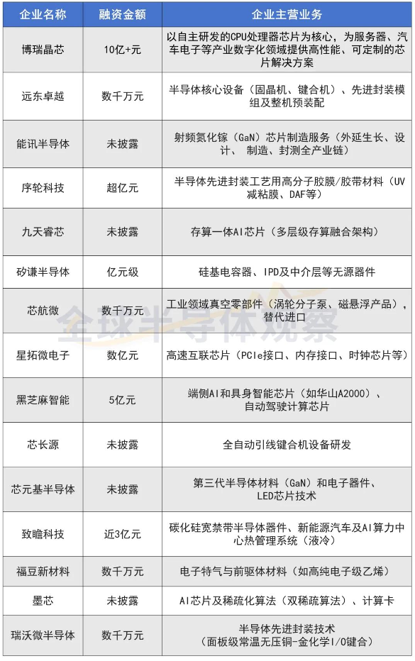 2026年初,國(guó)內(nèi)半導(dǎo)體賽道資本熱度持續(xù)增長(zhǎng),迎來(lái)新一輪融資熱潮,包括博瑞晶芯、遠(yuǎn)東卓越、黑芝麻智能、致瞻科技等在內(nèi)的15家企業(yè),在設(shè)備、材料、先進(jìn)封裝、AI芯片、射頻、互聯(lián)芯片等多個(gè)關(guān)鍵環(huán)節(jié)獲得重要資金支持,高端芯片與半導(dǎo)體設(shè)備領(lǐng)域成為資本角逐的核心熱點(diǎn),資本聚焦“卡脖子”環(huán)節(jié)集中發(fā)力。