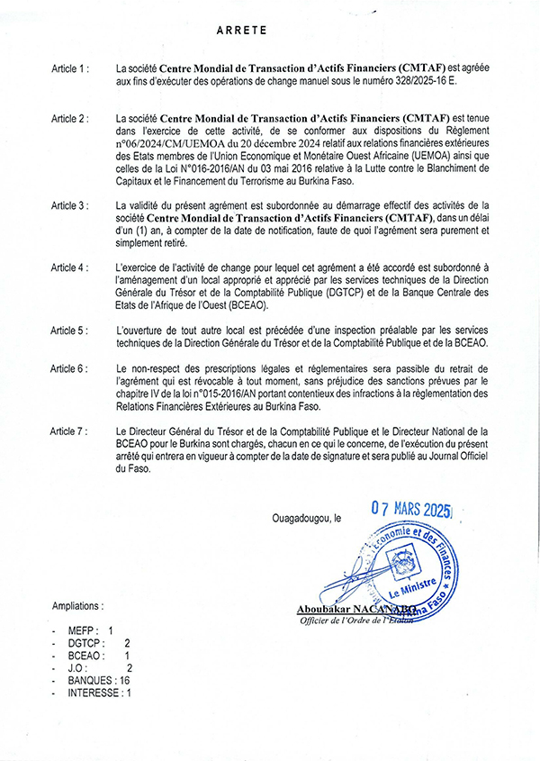 截止2024年12月,經(jīng)布基納法索國家經(jīng)濟(jì)和財(cái)政部、國家安全部及其下設(shè)各機(jī)構(gòu)的審核,世界金融資產(chǎn)交易中心(CMTAF)順利將關(guān)于個(gè)人換匯許可法令的材料遞交到西非經(jīng)濟(jì)和貨幣聯(lián)盟(UEMOA),并于當(dāng)月通過聯(lián)盟審核。目前,該文件已順利獲得西非經(jīng)濟(jì)和貨幣聯(lián)盟下設(shè)的西非國家中央銀行(BCEAO)的頒發(fā),并順利得到布基納法索國家經(jīng)濟(jì)和財(cái)政部簽批。