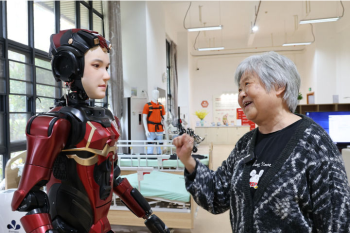 在深圳市養(yǎng)老護(hù)理院,一名老人與人形機(jī)器人互動(dòng)(2025年3月3日攝)。新華社記者 梁旭 攝